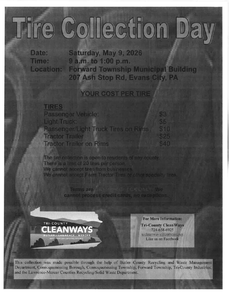 The annual Recycle/Cleanup Day for Connoquenessing Borough, Connoquenessing Township, Evans City Borough, and Forward Township is tenatively scheduled for two dates: